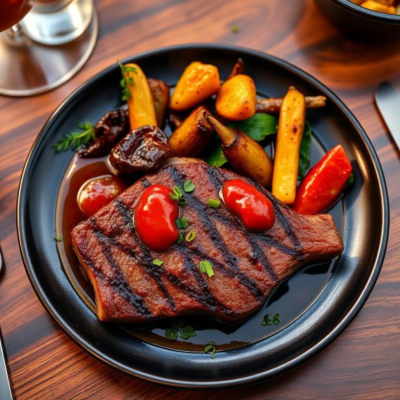 Grilled ribeye steak with chimichurri, roasted vegetables